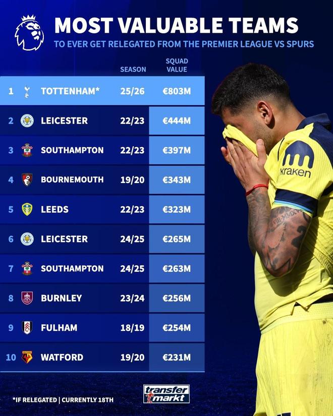 在该榜单上,目前排名第一的球队是2022-23赛季的莱斯特城队,当时球队以4.44亿欧元的总身价最终降入英冠。而如果热刺队真的不幸降级,他们也将以8.03亿欧元的总身价大幅刷新这一纪录。